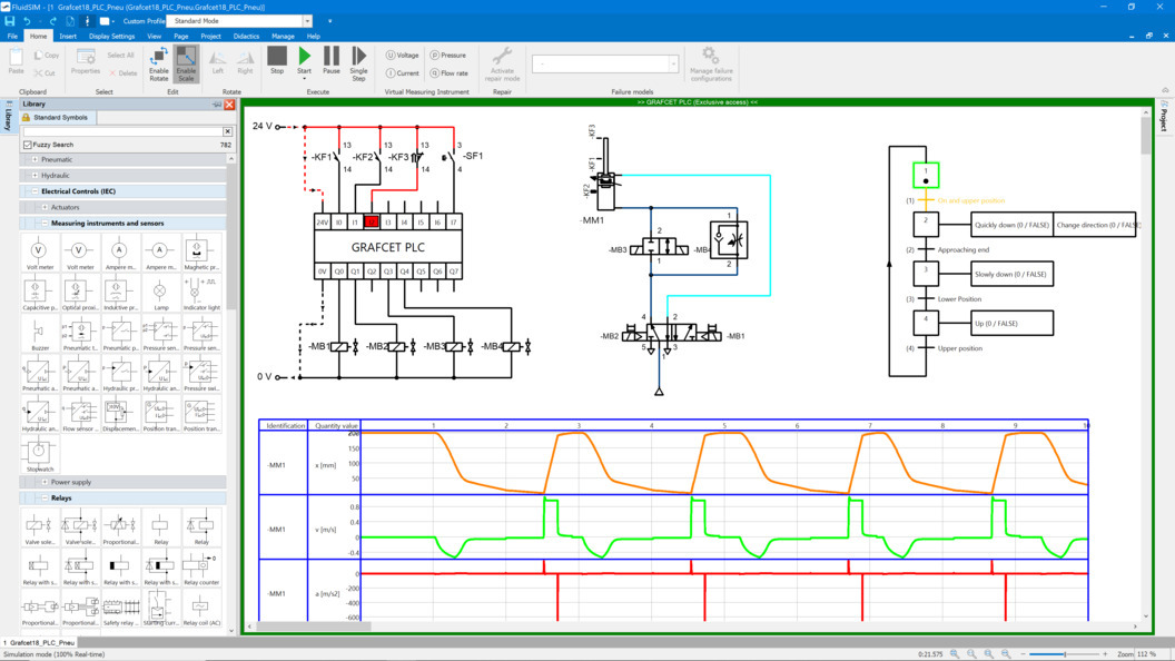 Mạch có thể được xây dựng từ thư viện các thành phần điện khí nén khác nhau. Ngoài ra, sơ đồ GRAFCET có thể được tạo và đưa vào mô phỏng nếu muốn.