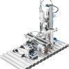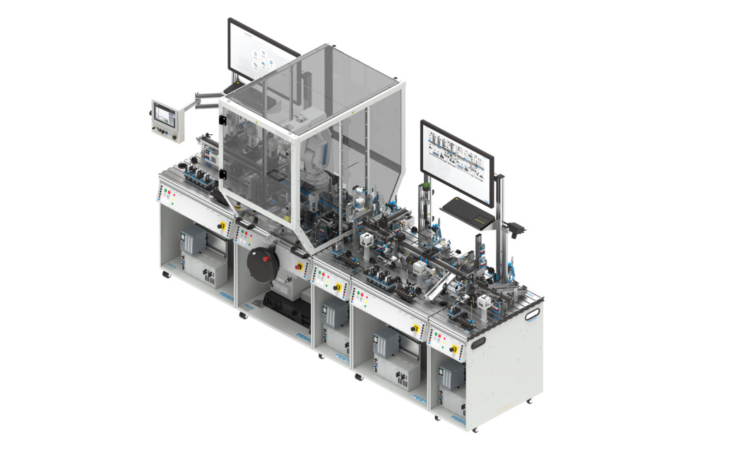 Nhà máy học tập MPS 405-1 bao gồm các mô-đun hệ thống MPS 400 Distributor Pro, Robot, Joining, Measurement Pro và Sorting Inline. Nó được kết nối mạng với MES, được trang bị các cảm biến RFID, HMI, IoT và IO-Link® và tạo thành một hệ thống tự cung tự cấp.
