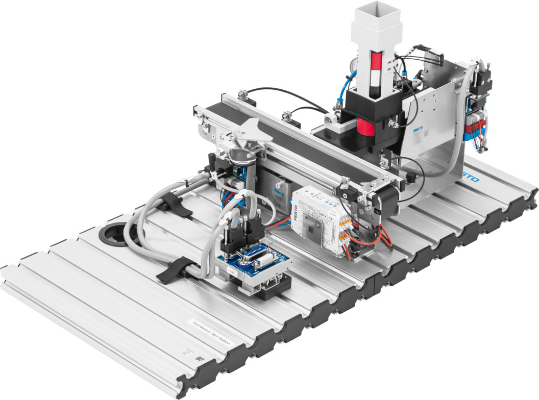 Trạm phân phối MPS D bao gồm, trong số những thứ khác, những điều cơ bản về lập trình PLC và công nghệ cảm biến. Ngoài ra, trạm còn cung cấp phần giới thiệu về điều khiển băng tải thông qua bộ điều khiển động cơ và vận chuyển vật liệu liên quan.